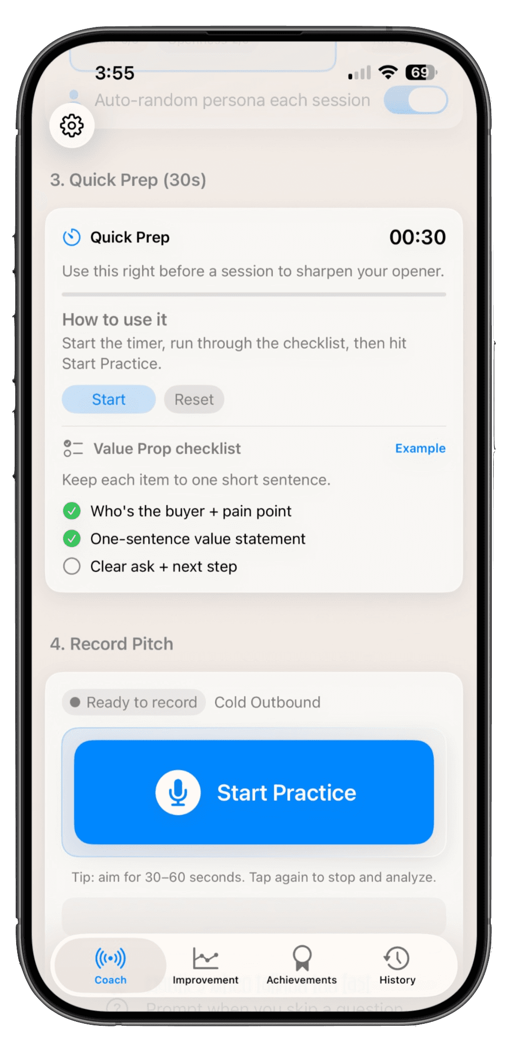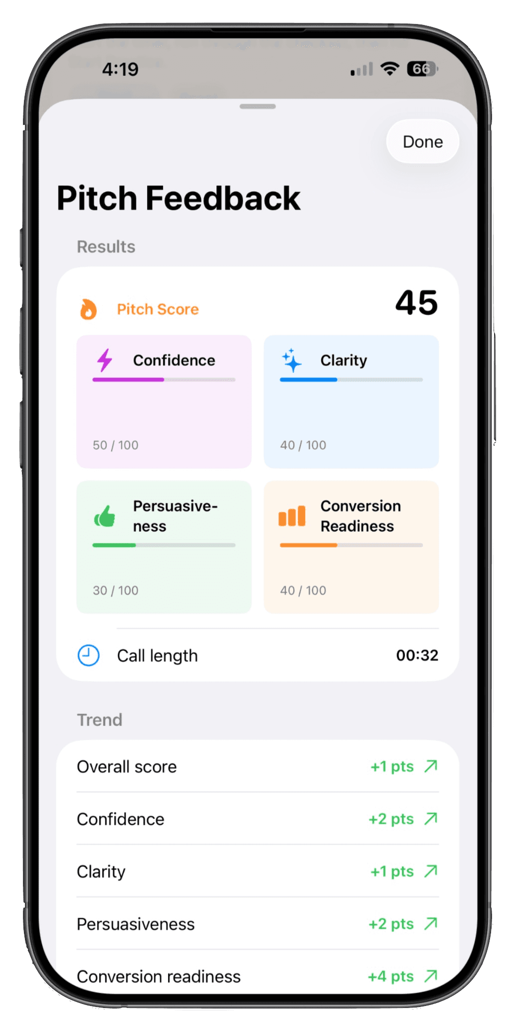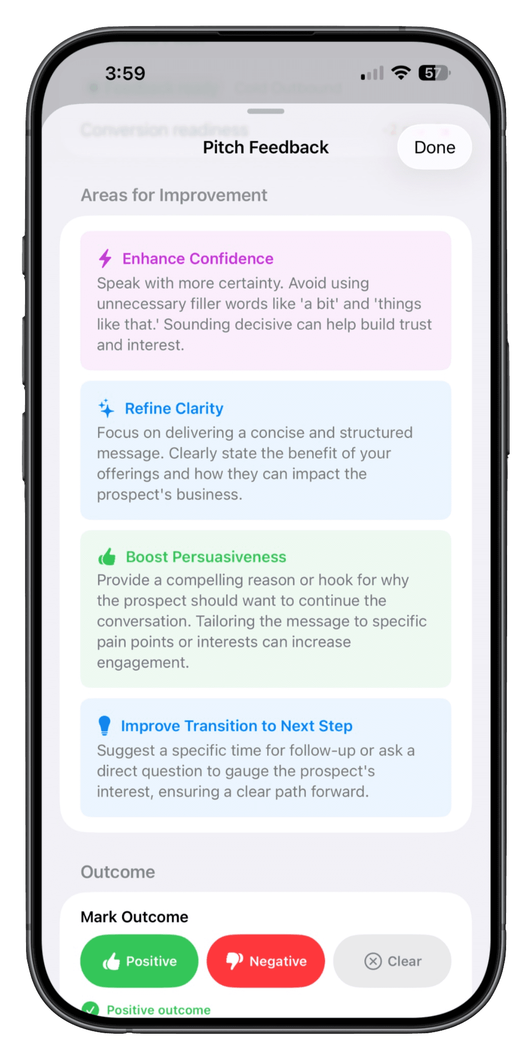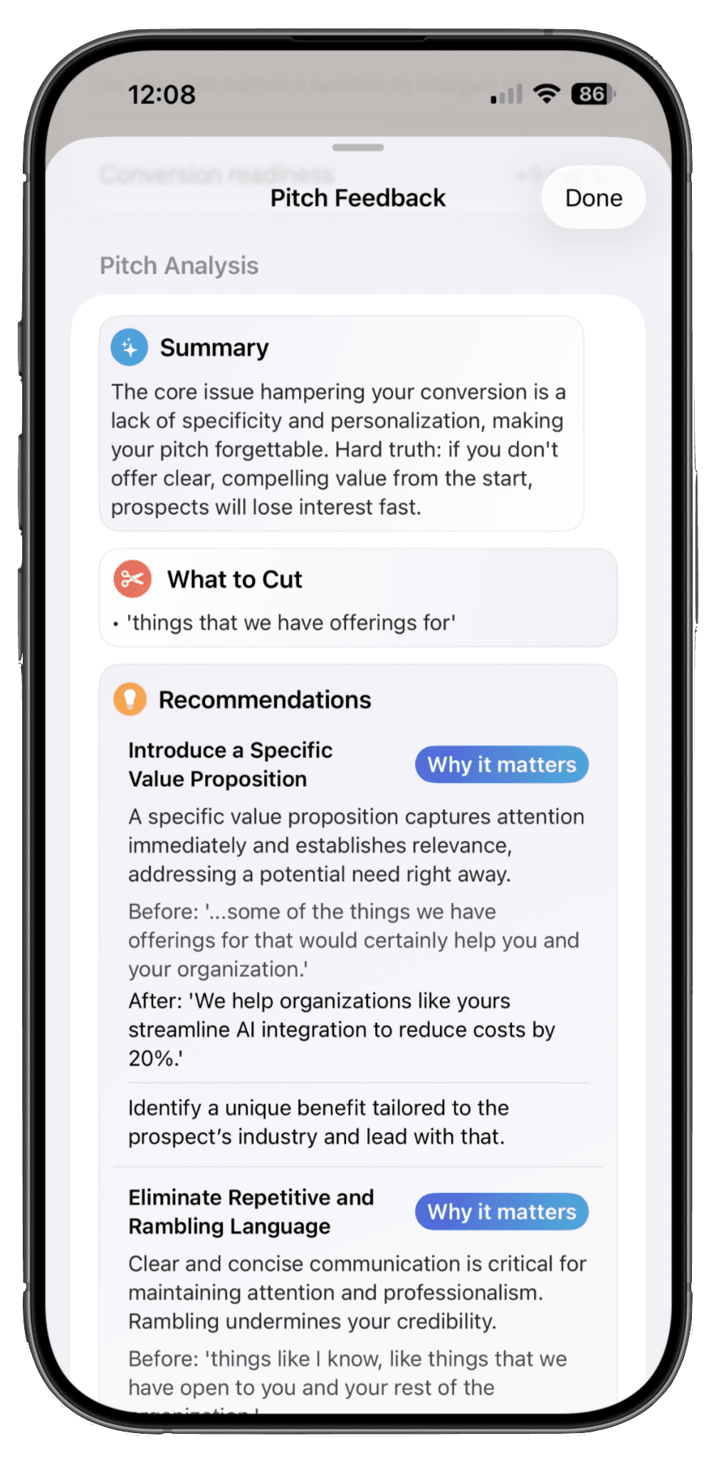 These features help users identify what to fix and how to improve before speaking with real prospects.
